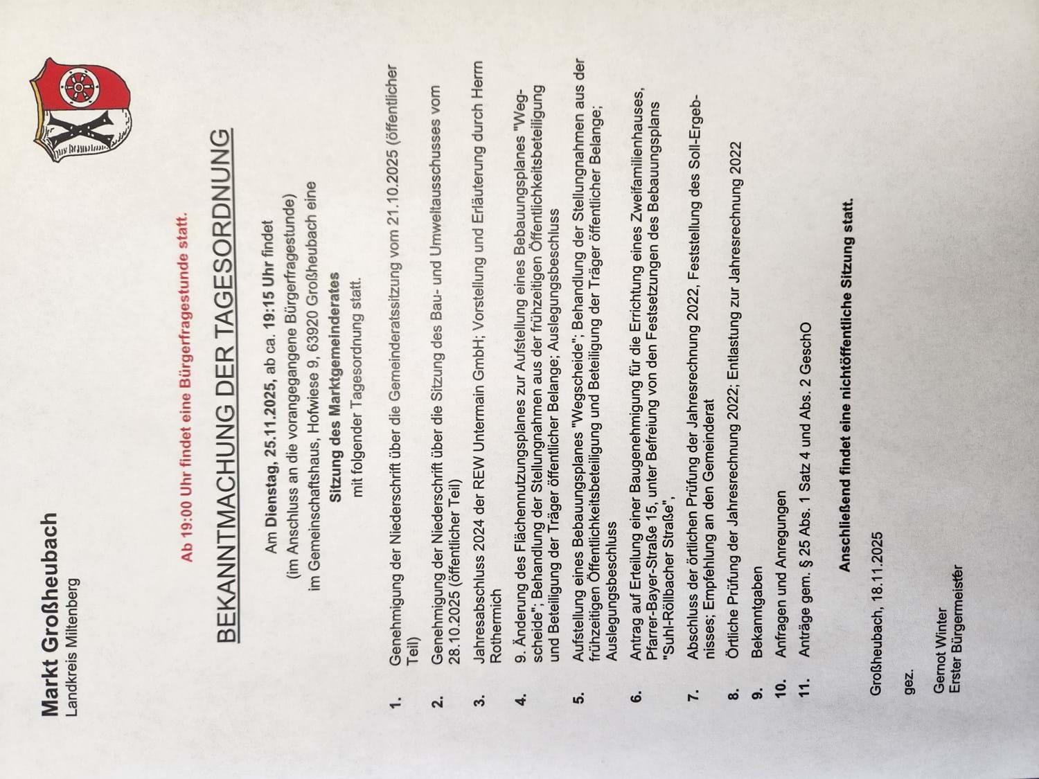 Bürger, die Anfragen stellen möchten, können diese auch telefonisch (Tel. 09371 40990) oder schriftlich (gerne auch per eMail info@grossheubach.de) bis 24.11.2025, 12:00 Uhr an die Gemeinde richten. Eine Beantwortung erfolgt dann – nach Möglichkeit – im Rahmen der Bürgerfragestunde vor der Gemeinderatssitzung. Wir möchten ausdrücklich darauf hinweisen, dass Wortmeldungen bzw. Anfragen zu Tagesordnungspunkten der sich anschließenden Gemeinderatssitzung nicht möglich sind (§ 18 Abs. 3 Satz 3 der Geschäftsordnung für den Marktgemeinderat Großheubach).